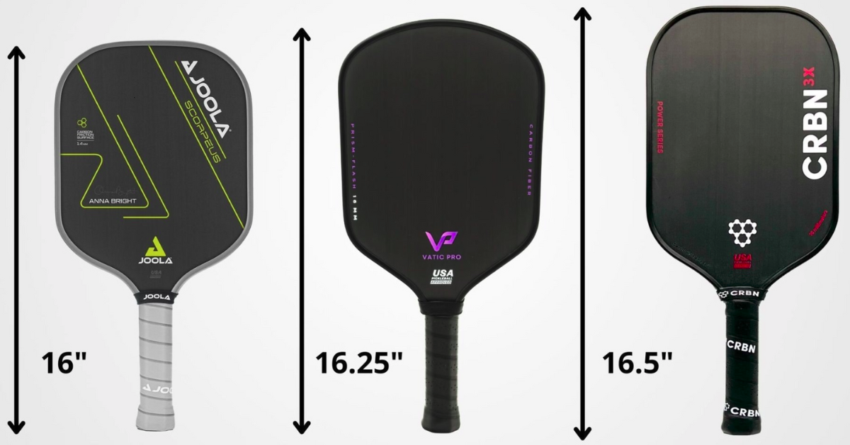 Vợt Pickleball có nhiều kích thước khác nhau về chiều dài và chiều rộng. Kích thước vợt ảnh hưởng đến khả năng tiếp xúc bóng và điểm ngọt (sweet spot). Vợt có bề mặt rộng hơn thường dễ đánh trúng bóng, trong khi vợt dài hơn có thể tạo ra cú đánh mạnh mẽ hơn.