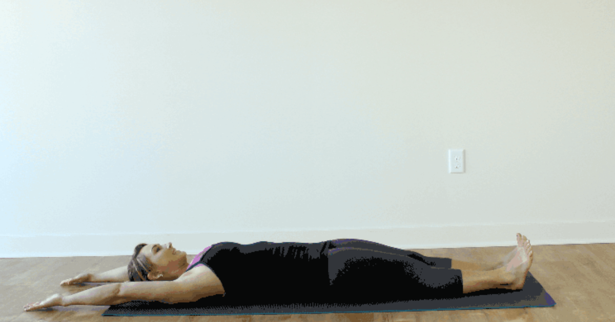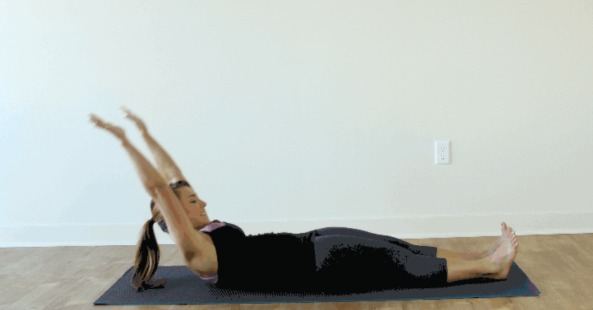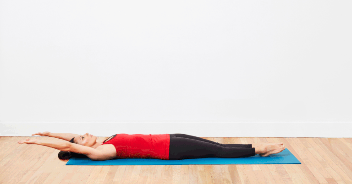 Nằm ngửa trên thảm, hai chân duỗi thẳng, hai tay đưa thẳng qua đầu, song song với sàn.