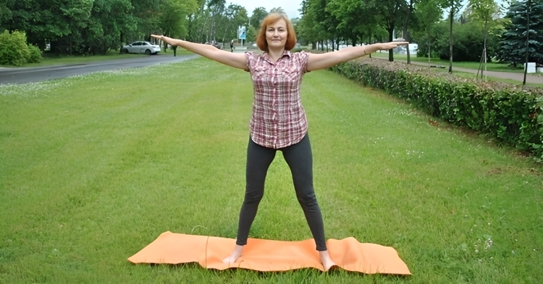 Bước 1: Đứng thẳng, hai chân khép sát hoặc rộng bằng hông, đặt đều trọng lượng lên hai chân.