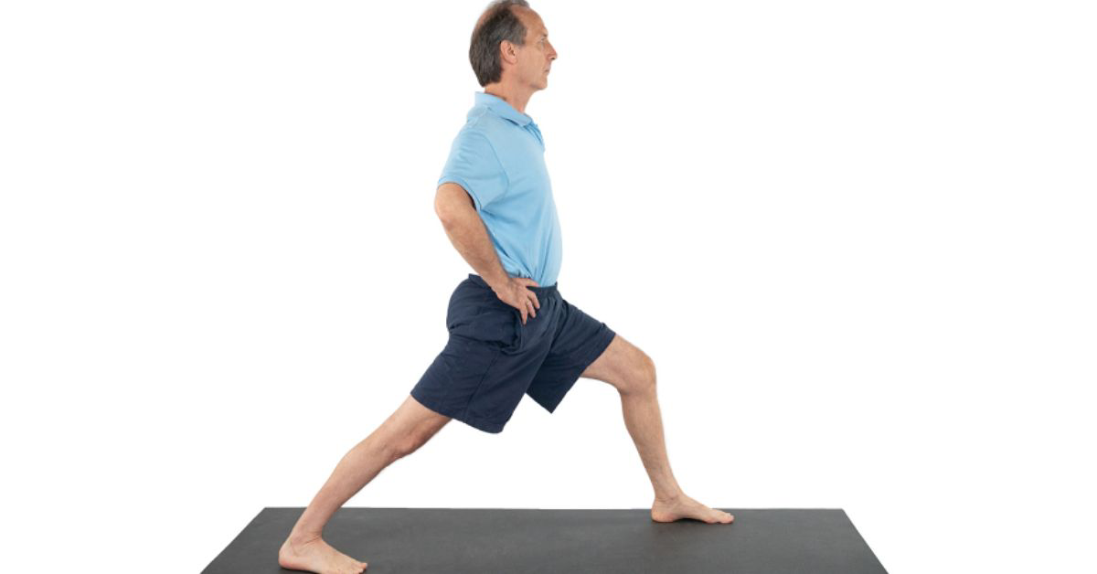 Bước 1: Đứng thẳng, bước chân phải ra sau, gập chân trước 90 độ, chân sau thẳng.
