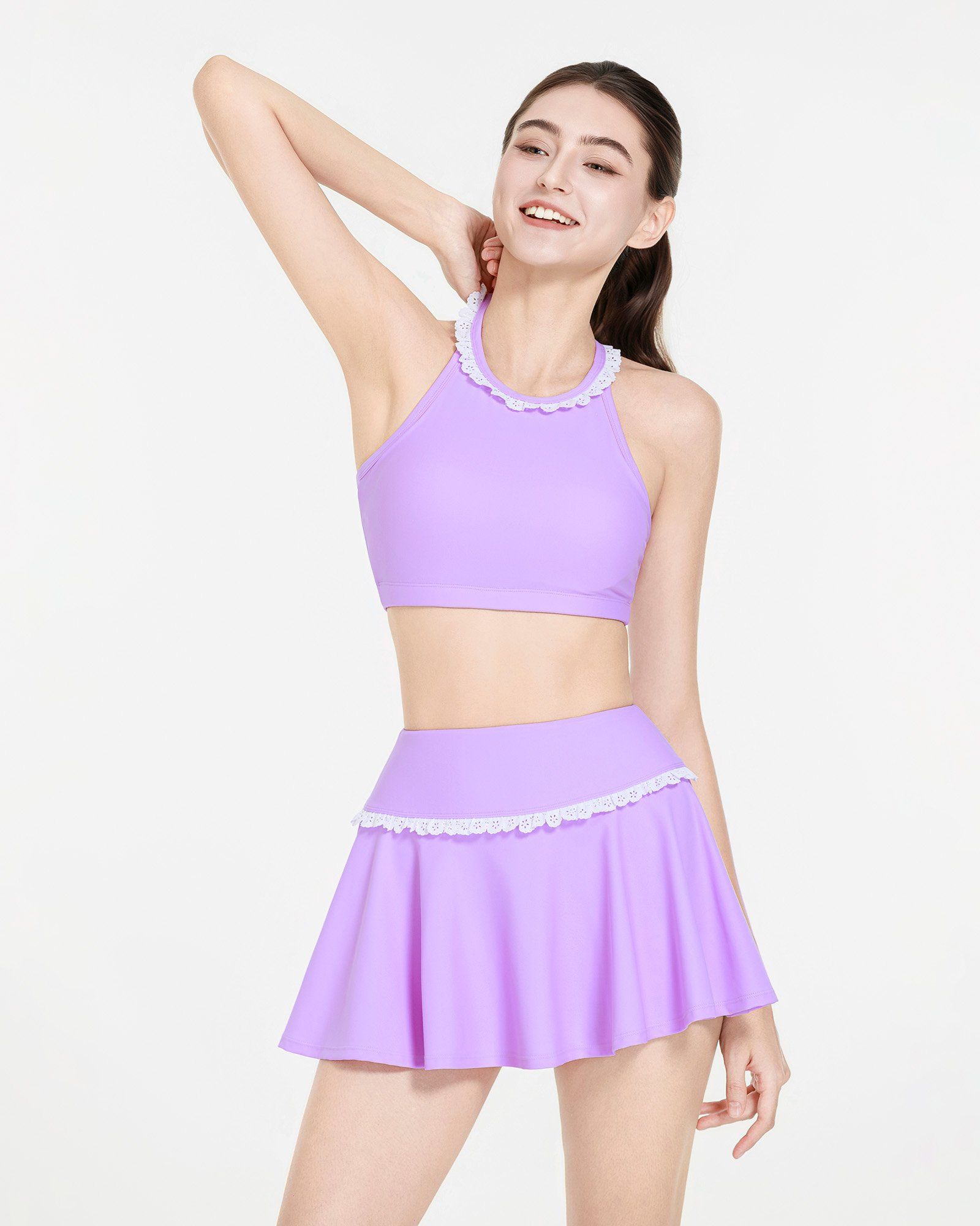 - Mẫu chân váy bơi được thiết kế dáng xòe nhún bèo trắng tạo sự năng động, sành điệu tạo nên vẻ ngoài tinh tế và thanh lịch.